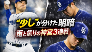 中日ドラゴンズ“少し”が分けた明暗 雨と焦りが狂わせた神宮3連戦 ヤクルトとの神宮3連戦は、カード負け越しという結果に終わった。だが、この3試合を通して見えたのは、大きな差ではない。ほんの“少し”の違いだった。初戦。柳には「今年こそは」という強い思いがあった。開幕前までに揺らいでいた信頼を取り戻すため、一... 2026.04.07中日ドラゴンズ